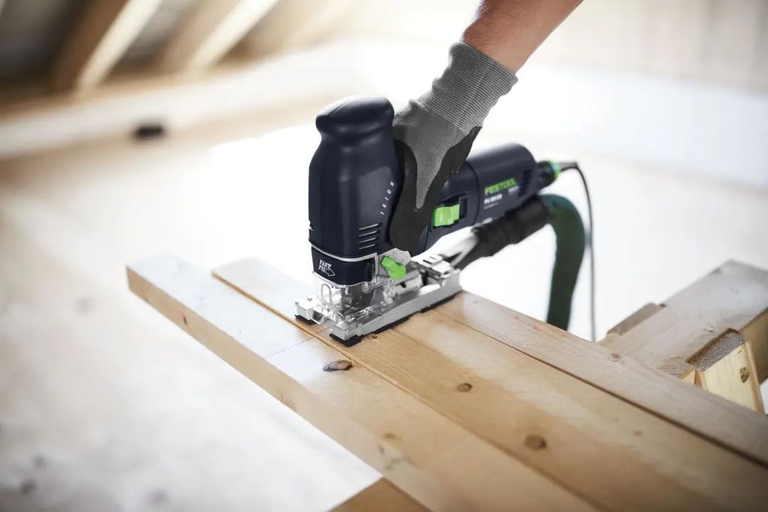 再来看曲线切割,费斯托工具PS 300曲线锯,三重锯片导向控制与可平行调节的硬质合金卡爪确保切割的精度,采用了简单但可有效确保无爆边切割的防毛边块,以及FastFix锯片快速更换系统。曲线切割不再只是粗切!