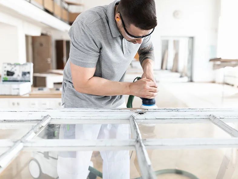 提示:沿着纹理的线性轨迹打磨并不会损坏木质纤维(例如如果表面要上油、上蜡或涂上一层薄薄的清漆这一点很重要)。直线研磨运动不会向两侧偏移。因此,线性磨机特别适合于打磨毗邻玻璃窗的框架部分。