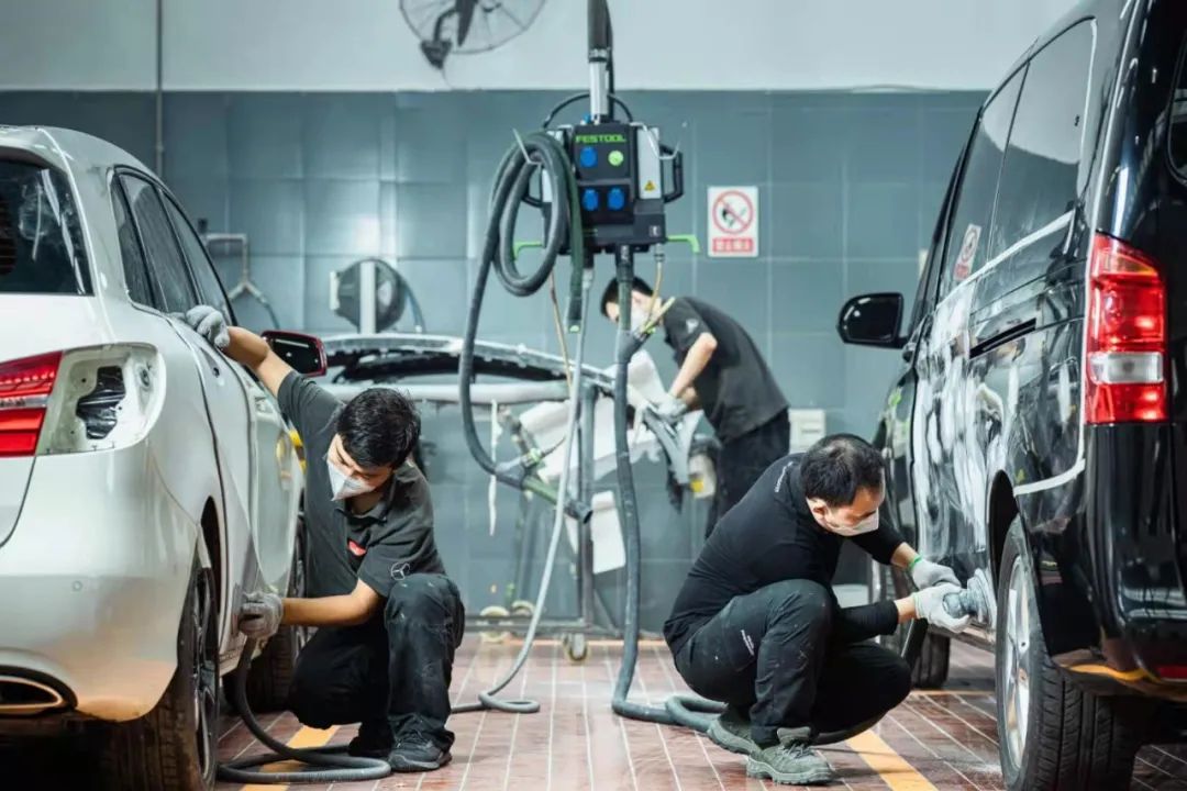 以华星锦业金牛奔驰4S店为例,根据现场条件,规划并安装中央集尘系统,提供全程无尘干磨工艺的技术服务支持,打造成为 QSP 绿色样板店。